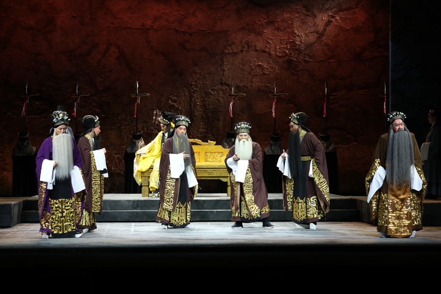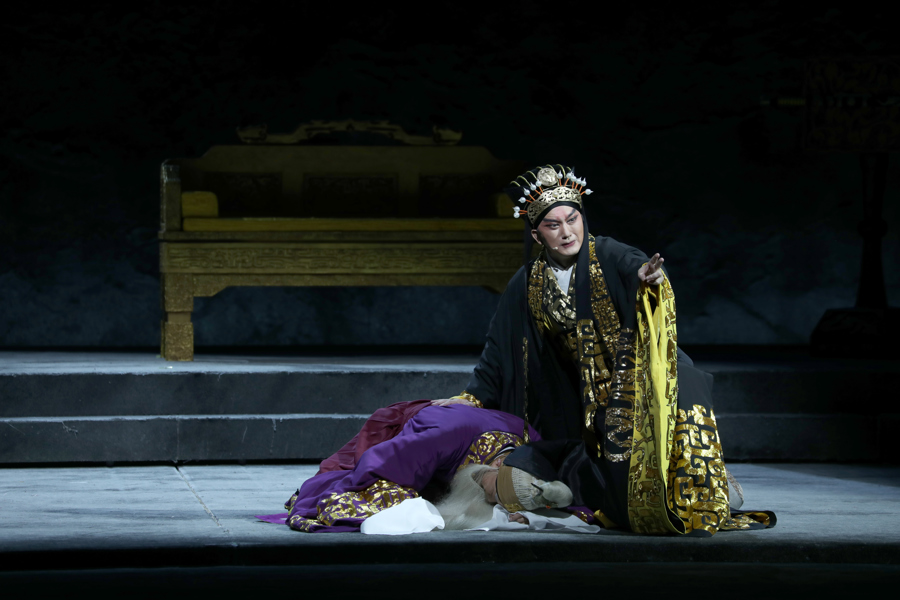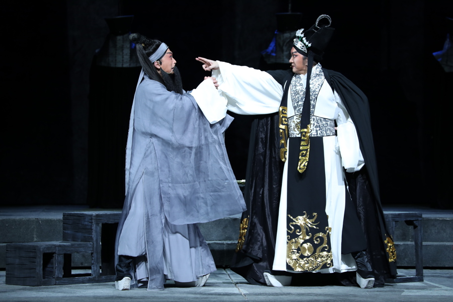傅希如饰演的汉武帝刘彻,唱腔以余派为基调,融合麒、高等老生流派。与公孙弘、张骞的两场重头戏中,刘彻表面波澜不惊,内心跌宕起伏,“面对公孙弘的病体,他怒其不争、哀其不幸,一段‘二黄三眼’婉转沉郁、五味杂陈。第五场有一大段表现内心独白的‘反二黄’,从担忧霍去病到回想登基以来的风云变化,再到为了百姓安乐一往无前的壮怀大志,一波三浪、高潮迭起。一轮接着一轮情绪激烈的演唱直至最后一场,还有大段‘反二黄’,对演员唱功要求极高。”