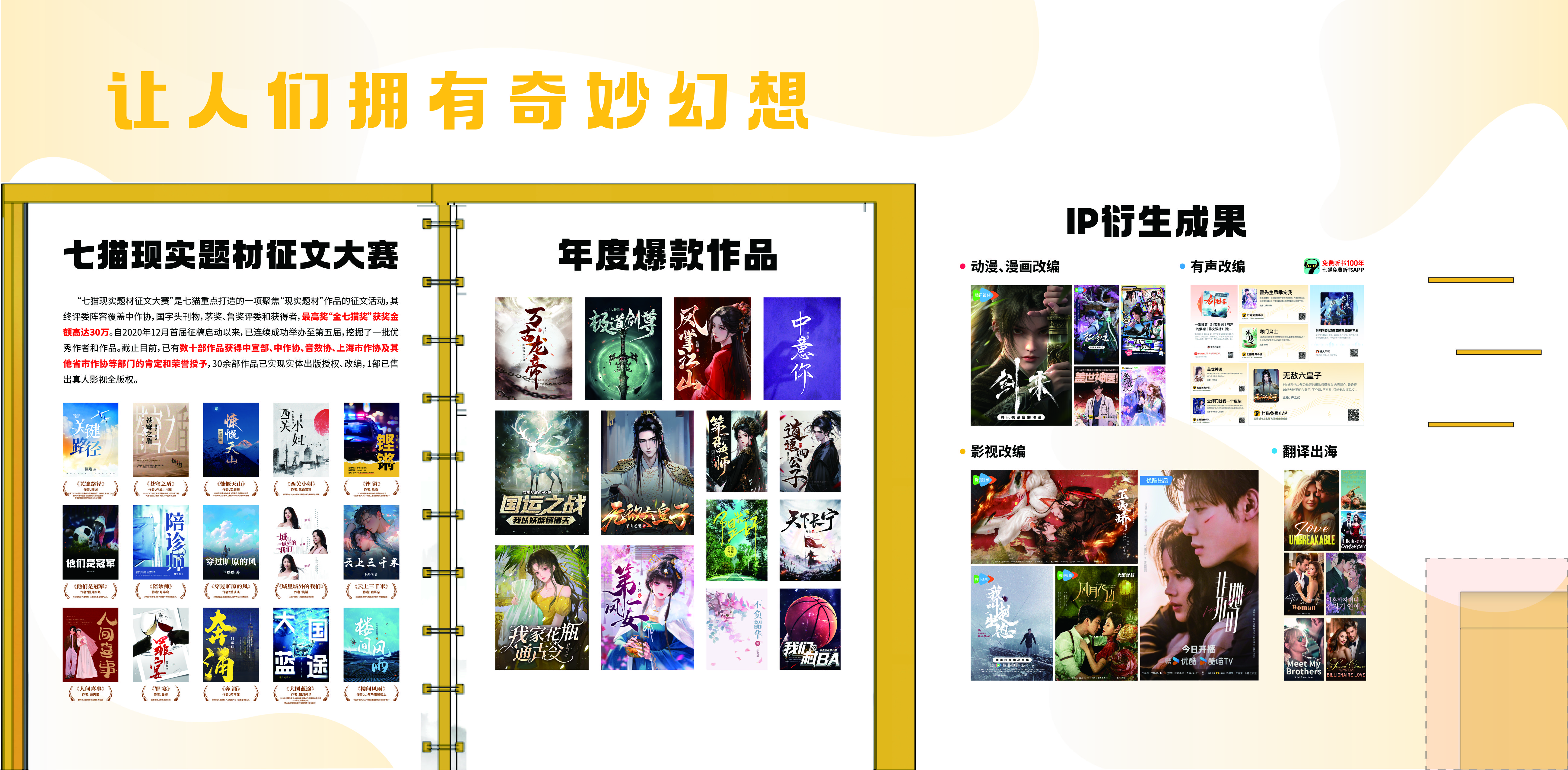 上海七猫文化传媒有限公司(简称“七猫”)是一家以“数字阅读服务”为基础的综合性文化产业公司,累计服务作者超170万,服务用户超6亿。本届长三角文博会上,七猫将重点展示七猫现实题材征文大赛成果、年度爆款原创作品、IP衍生成果等亮点。作为七猫今年新开拓的业务线,七猫免费听书App和七猫免费小说App短剧频道也将于本届长三角文博会首次向公众亮相。