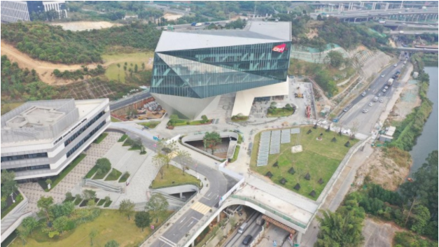 香港城市大学(东莞)项目(一期)及扩建工程位于东莞市,莞深高速南侧。总建筑面积约12.97万平方米,包含教学办公楼、宿舍楼、行政楼、体育馆、食堂、活动中心等15栋单体建筑,一期扩建工程由图书馆及凌空平台组成,建筑面积2.08万平方米。