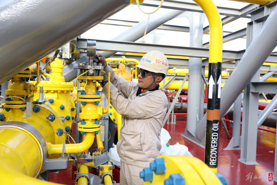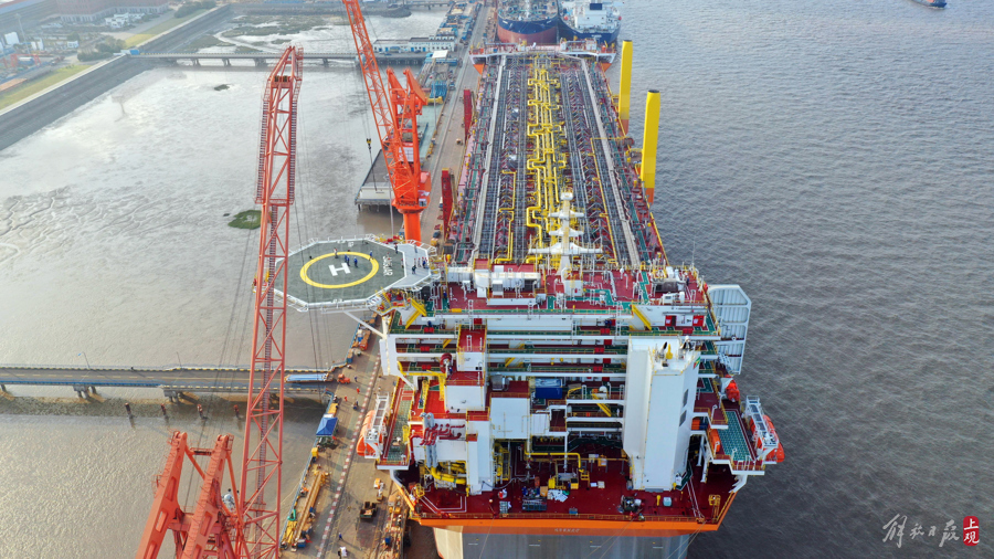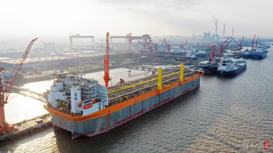 外高桥造船厂持续保持“满坞生产,密集交船”的忙碌状态。目前已开工还未交付的共有23艘船,其中通用型海上浮式生产储油轮(FPSO)是外高桥首次建造,主要用途类似海上加工厂,即把陆地上的炼油厂搬到海上去,号称“海上油田的心脏”。