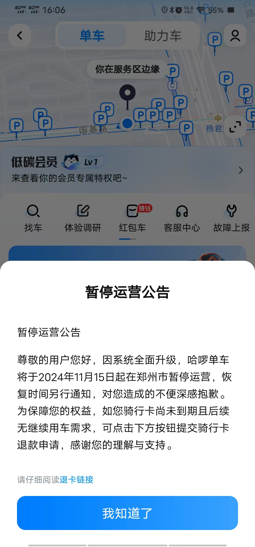 当天,有消息称哈啰单车也同步停运。哈啰相关负责人回应澎湃新闻记者称,哈啰正对郑州的车辆进行全面系统升级,将于维护后会重新开放使用,为用户提供更优质的骑行服务。对此给市民造成的出行不便也深感抱歉,具体内容及退款细则详见哈啰APP相关公告。
