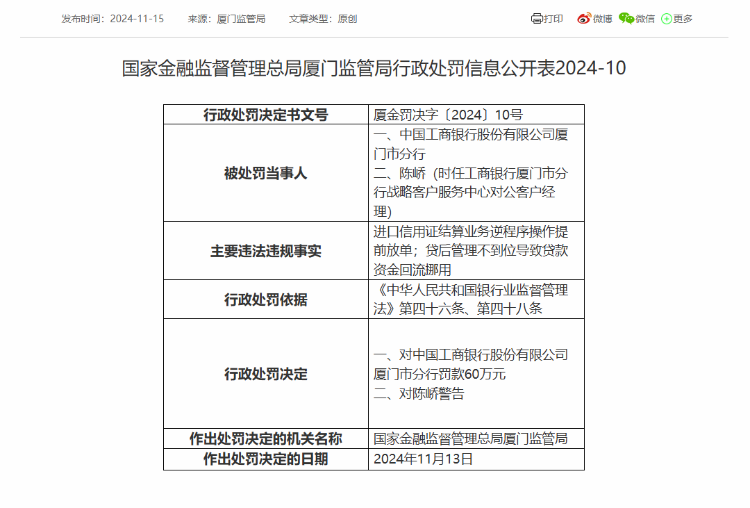 据国家金融监督管理总局厦门监管局行政处罚信息披露,中国工商银行股份有限公司厦门市分行,因进口信用证结算业务逆程序操作提前放单;贷后管理不到位导致贷款资金回流挪用,被罚款60万元。