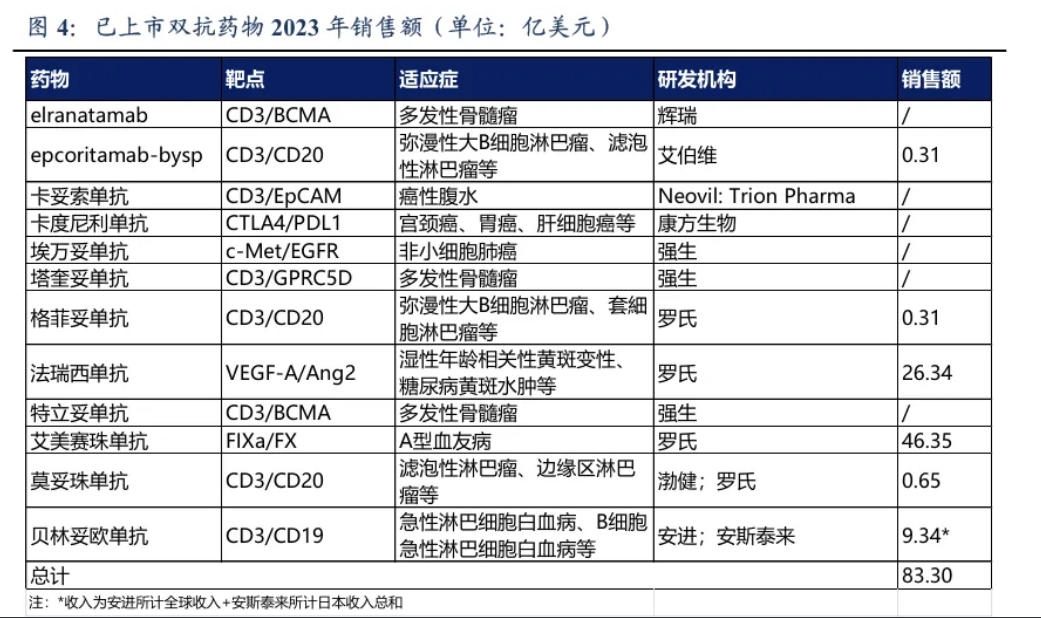 据Market.us数据,全球双抗药物市场规模预计从2024年到2033年将以37.5%的复合年增长率增长,至2033年市场规模将达到约1926亿美元。双抗药物潜在的千亿市场,罗氏、安进、强生等跨国药企以及康方生物、信达生物、中国生物制药等国内创新药企均有布局,部分潜力已经直接体现在销售额上。