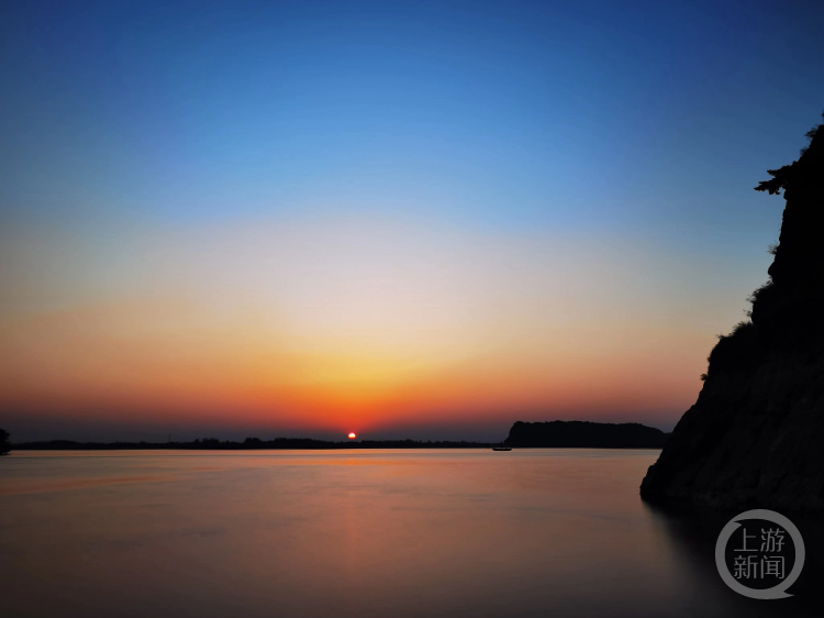 从荆州公安县到石首的一段水域,两岸森林葱郁,太阳西斜,光从树梢打下来,绿色与金黄色穿插,“生动展示了什么叫‘落霞与孤鹜齐飞,秋水共长天一色’。我当时正在直播,很多观众都说这个画面绝了。”