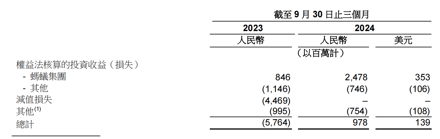 11月15日,阿里巴巴发布截至2024年9月30日止的3个月未经审核业绩公告。其中,截至2024年9月30日止三个月的权益法核算的投资损益为收益人民币9.78亿元(1.39亿美元),其中,从蚂蚁集团获得的收益为24.78亿人民币(3.53亿美元)。根据阿里巴巴在蚂蚁集团持股33%计算,本季度蚂蚁集团净利润为75.09亿元人民币(10.7亿美元)。