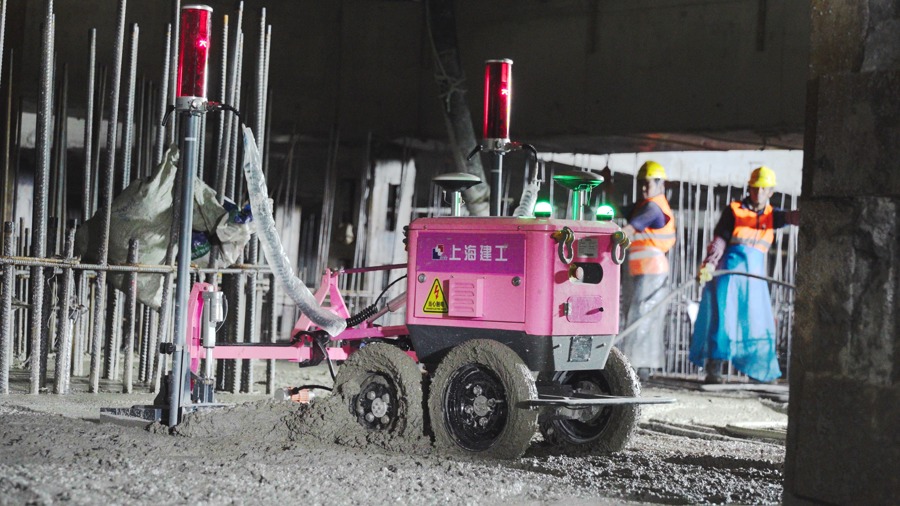 在混凝土整平阶段,引入了双自由度自适应系统,配合地面整平机器人和地面抹光机器人进行底板混凝土施工。依托GNSS导航系统,机器人能够自动规划整平和抹光的路径,实现了全自动无人化施工,大幅提升了施工效率,同时确保了施工的安全性。
