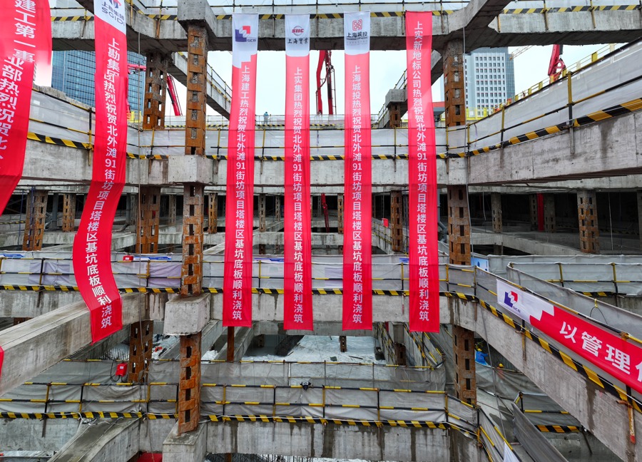 上海建工北外滩91街坊项目经理郝占豪介绍,北外滩91街坊项目主塔部分基坑面积9469平方米,最大挖深达31.5米,耗时99天完成土方开挖26万方,15天完成吊运绑扎大底板钢筋8900吨,本次浇筑的底板厚度普遍达到5.5米,而在局部深坑厚度达8.7米。作为480米高的摩天大楼及其地下室的底板,它将和其下方的655根主楼桩基一起承载起北外滩新地标99层主楼的负载。