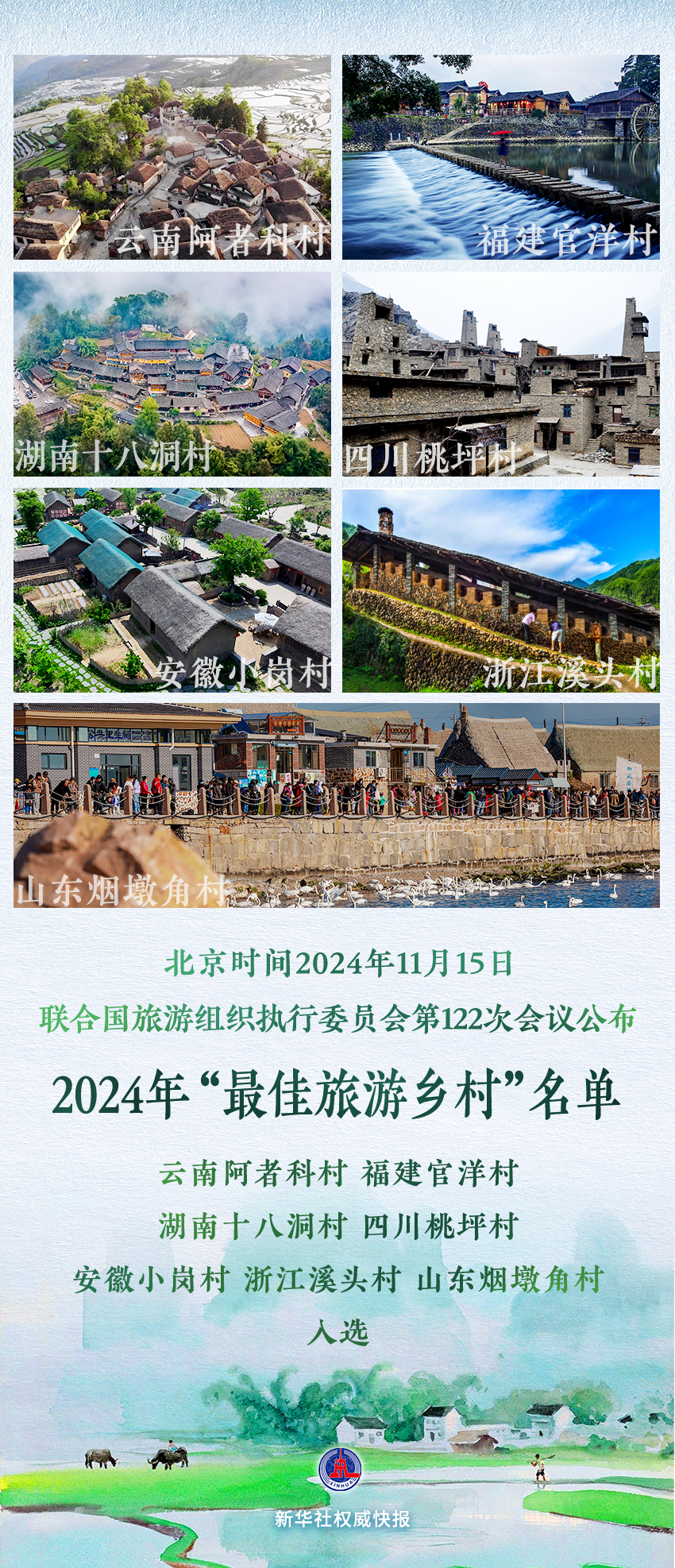 北京时间11月15日,在哥伦比亚卡塔赫纳举行的联合国旅游组织执行委员会第122次会议上,公布了2024年“最佳旅游乡村”名单,我国申报的云南阿者科村、福建官洋村、湖南十八洞村、四川桃坪村、安徽小岗村、浙江溪头村、山东烟墩角村等7个乡村入选,是本届入选乡村最多的国家。