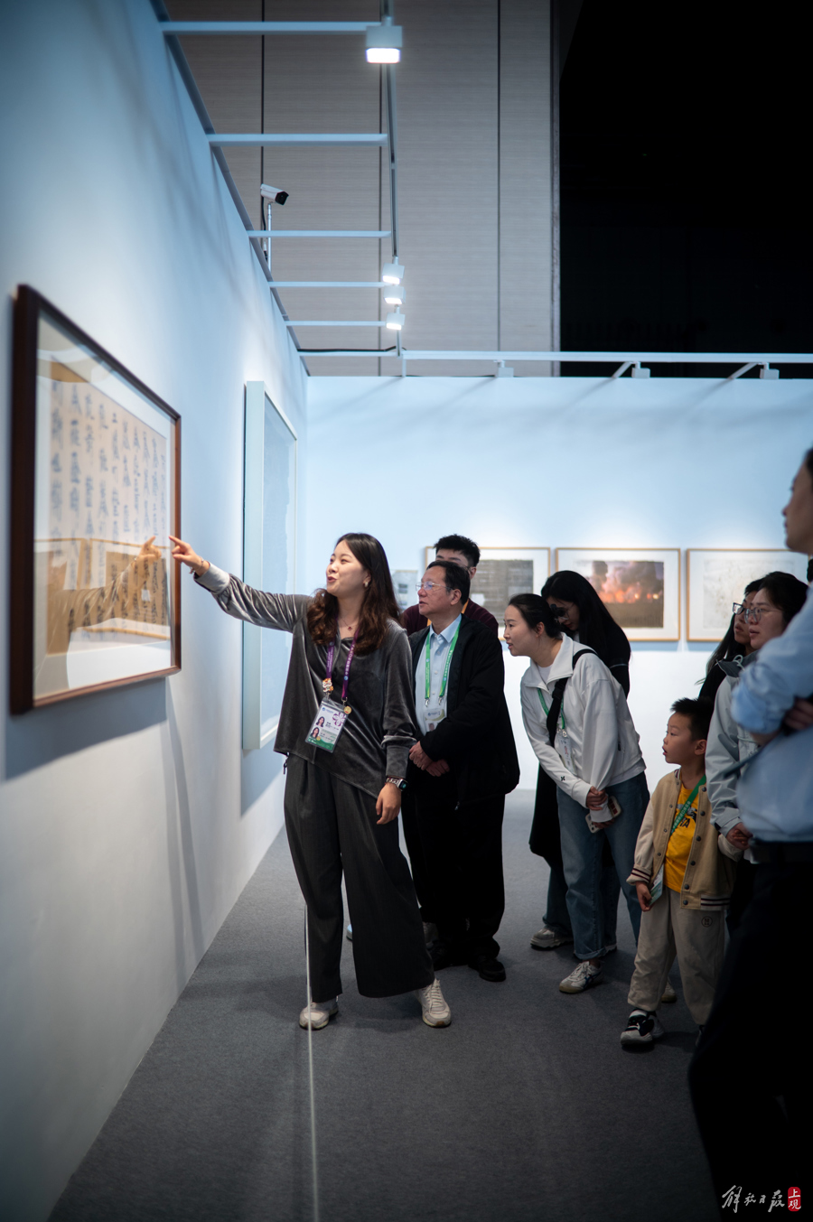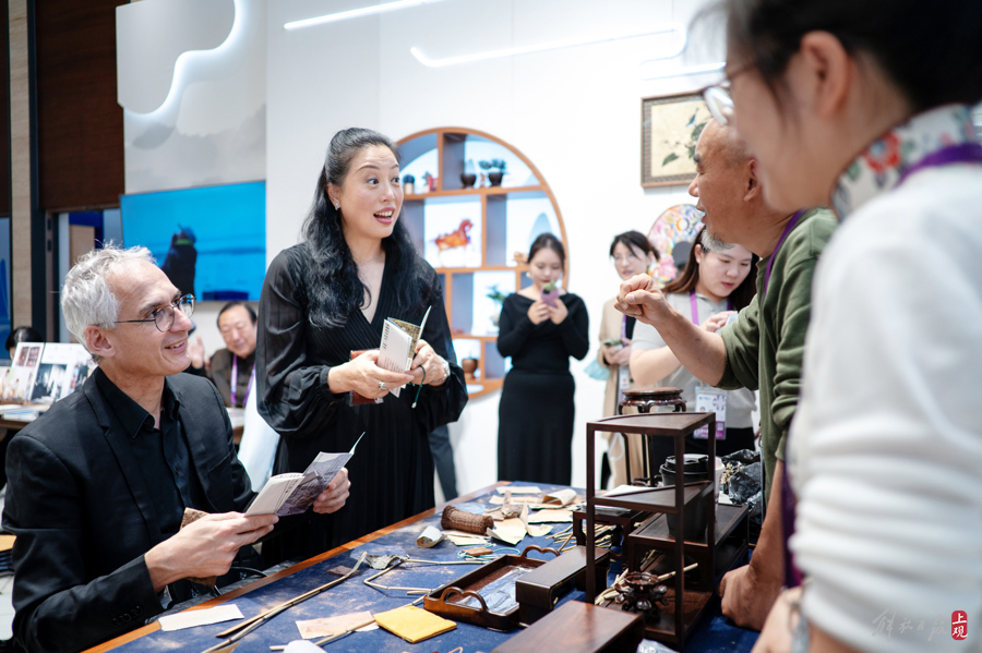 2024年11月4日,以“邂逅·印象”为主题,由中国上海国际艺术节选送的法国史诗室内乐团带来中法经典作品音乐会为第七届中国国际进口博览会新闻中心艺术空间启幕。艺术家们表演结束后,饶有兴趣地参观了进博会非遗客厅,体验了来自苏州的漆器艺术文化。