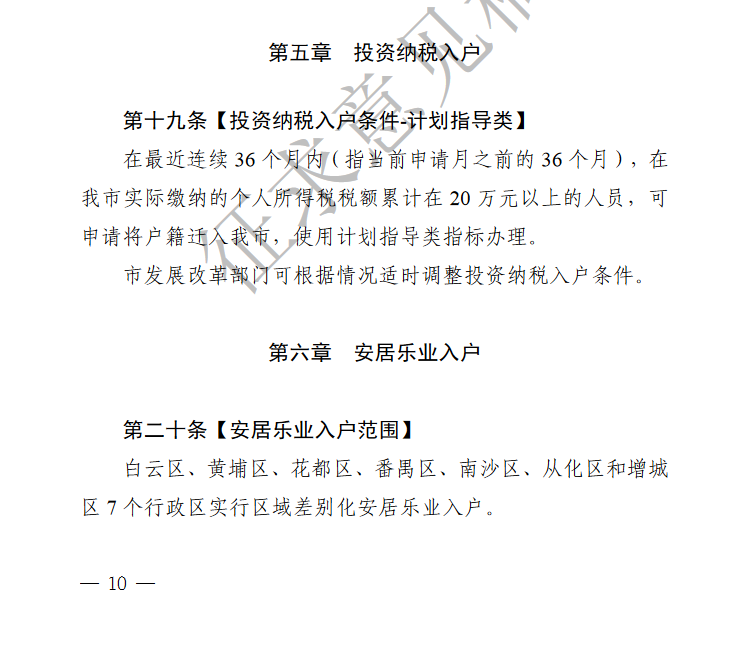 修订稿关于安居乐业入户的相关内容显示,“在白云区、黄埔区、花都区、番禺区、南沙区、从化区和增城区7个行政区内,拥有合法产权住宅房屋且在本市连续缴纳社会保险满1年的人员”,可申请入户。
