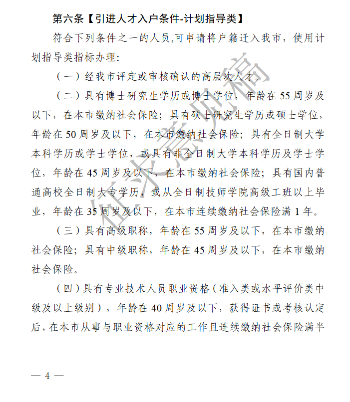 此外,《规定(修订稿)》拟放宽引进人才入户条件。全面支持高层次人才入户,不受年龄、社保等限制;放宽年龄限制,博士、硕士、本科入户年龄条件均放宽5岁(博士由50周岁放宽到55周岁;硕士由45周岁放宽到50周岁;本科由40周岁放宽到45周岁);降低学历门槛,允许大专学历入户(具有国内普通高校全日制大专学历,或全日制技师学校高级工班以上毕业的人员,年龄35周岁及以下,在本市连续缴纳社会保险满一年)。