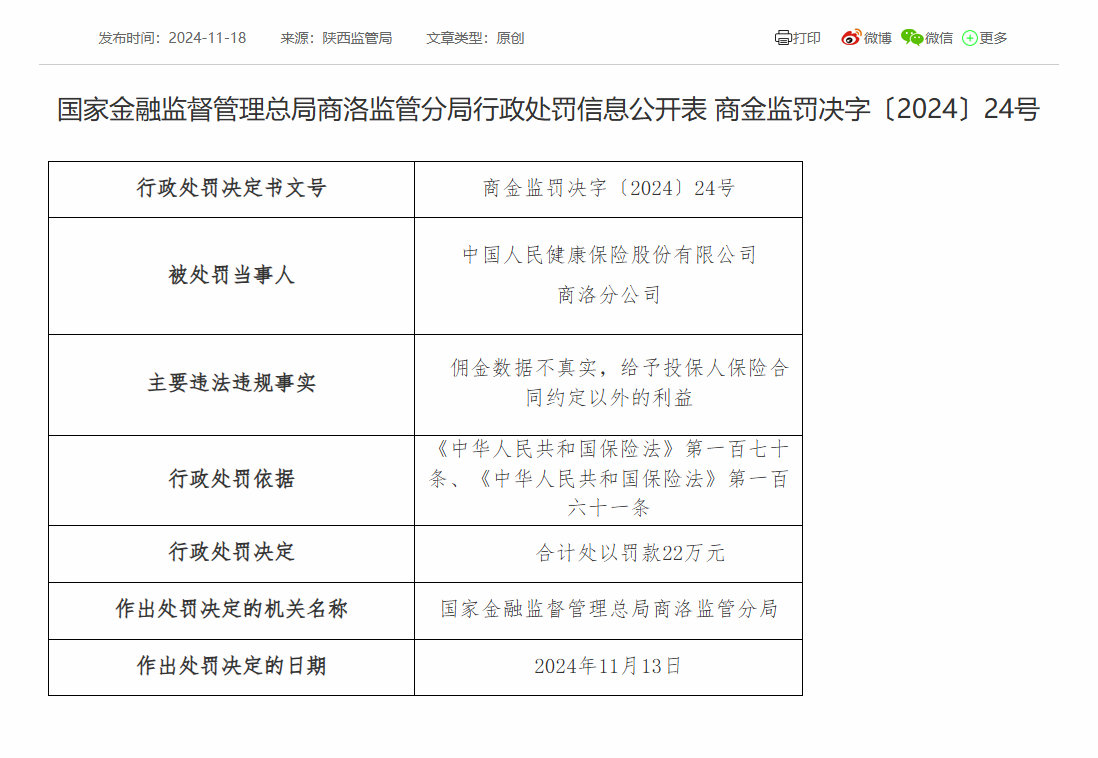 国家金融监督管理总局商洛监管分局行政处罚信息公开表显示,中国人民健康保险股份有限公司商洛分公司因佣金数据不真实,给予投保人保险合同约定以外的利益,被国家金融监督管理总局商洛监管分局罚款22万元。