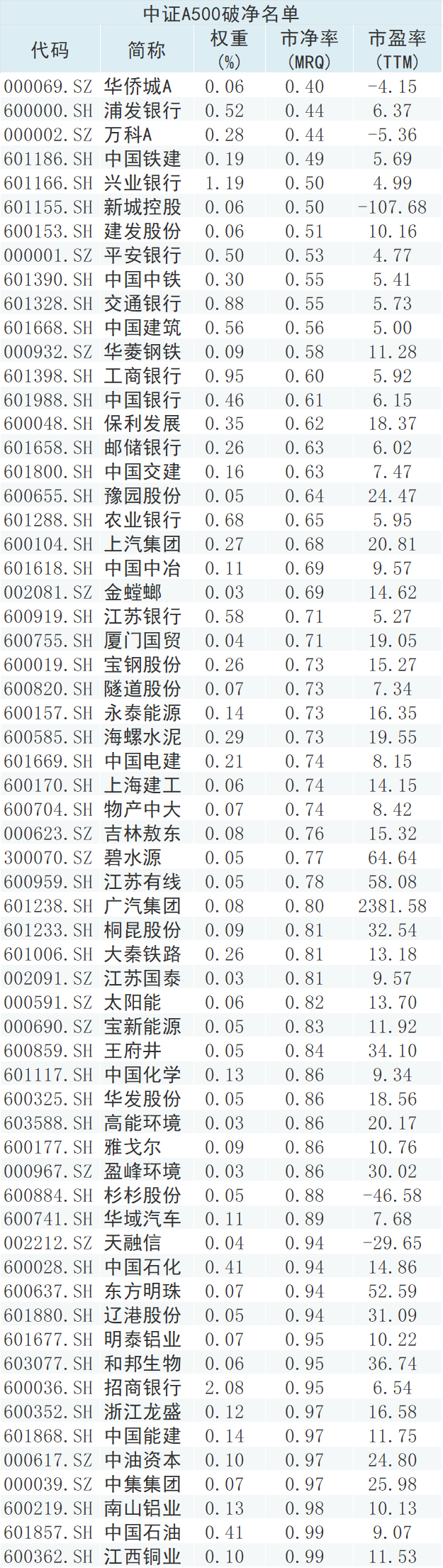 Wind数据还显示,从指数成分股来看,中证A500成分股中有62只破净,权重合计14.84%;沪深300成分股中有46只破净,权重合计18.79%;创业板指成分股中,仅碧水源(300070.SZ)破净,占指数权重0.31%;创业板中盘200成分股中有3只破净,权重合计0.54%;科创50、科创100、北证50成分股暂无破净。