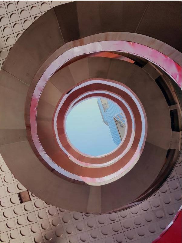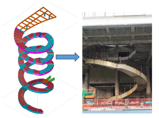 独具匠心的设计理念带来的是更高的施工难度,也给项目团队带来了技术与工艺领域的巨大挑战。在面对复杂地下室结构与混凝土内支撑的受力转换、大尺度体型扭转的精密控制以及全专业立面穿插施工等技术难题时,中建一局集团建设发展有限公司项目团队展现出了卓越的工程智慧与创新精神。以项目裙房屋面至地下一层部分配设的巨型旋转钢结构楼梯建设过程为例,其高度达31米,跨度达15米,整体造型为螺旋上升。由于空间曲率多维度变化、整体结构中包含36段各异的异形构件,以及临时支撑复杂多变,该工程的施工难度极大。项目团队依托BIM技术、超高层异型钢结构安装的精确测量控制技术、大管径倾斜相贯圆管施工创新技术以及超长钢板的一体弯曲成型等前沿技术,成功攻克了这些技术难题,实现了螺旋钢楼梯从加工到安装的全过程模拟与精准控制。