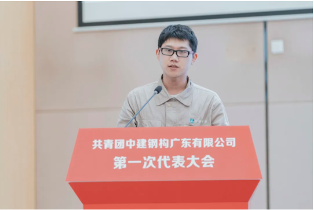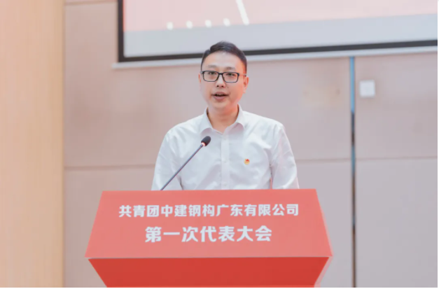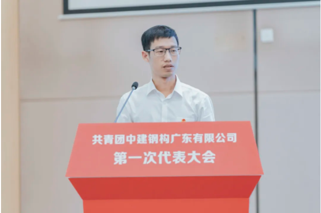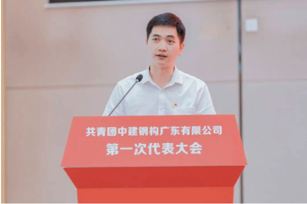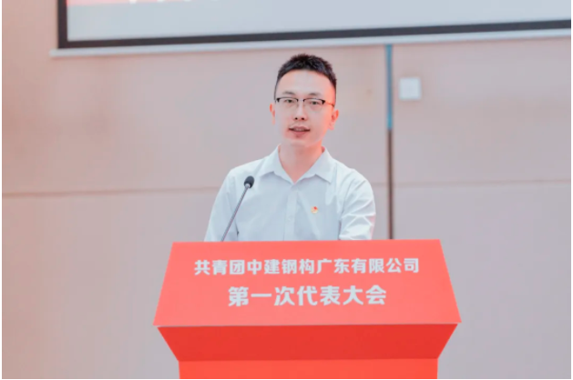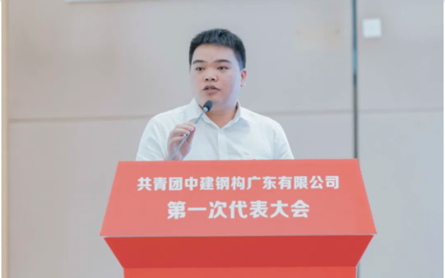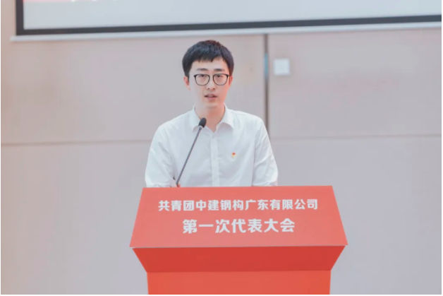 中建钢构广东有限公司综合办公室负责人刘志远作题为《高举团旗跟党走,接续奋斗建新功,奋力书写公司高质量发展的青春篇章》的报告。