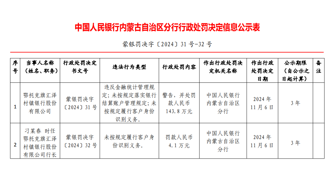 据央行内蒙古自治区分行行政处罚决定信息披露,鄂托克旗汇泽村镇银行股份有限公司,因违反金融统计管理规定;未按规定落实银行结算账户管理规定;未按规定履行客户身份识别义务,被罚款143.8万元。
