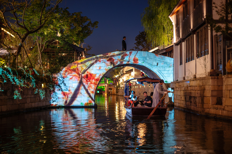 蟠龙天地的夜晚呈现出江南的诗情画意。