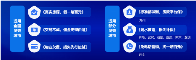 为此,贝壳平台建设基础能力,联合平台合作的所有经纪品牌(以城市为维度)共同推出“平台级服务承诺”,全部品牌愿意做出承诺并承担履约行为,贝壳平台提供兜底服务,以此解决服务一致性问题,并进一步提升消费者的服务质量。