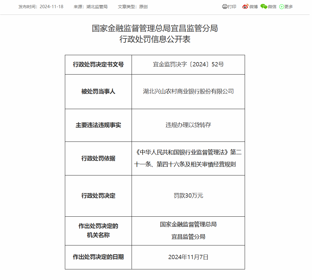 因违规办理以贷转存,湖北兴山农村商业银行被罚30万元