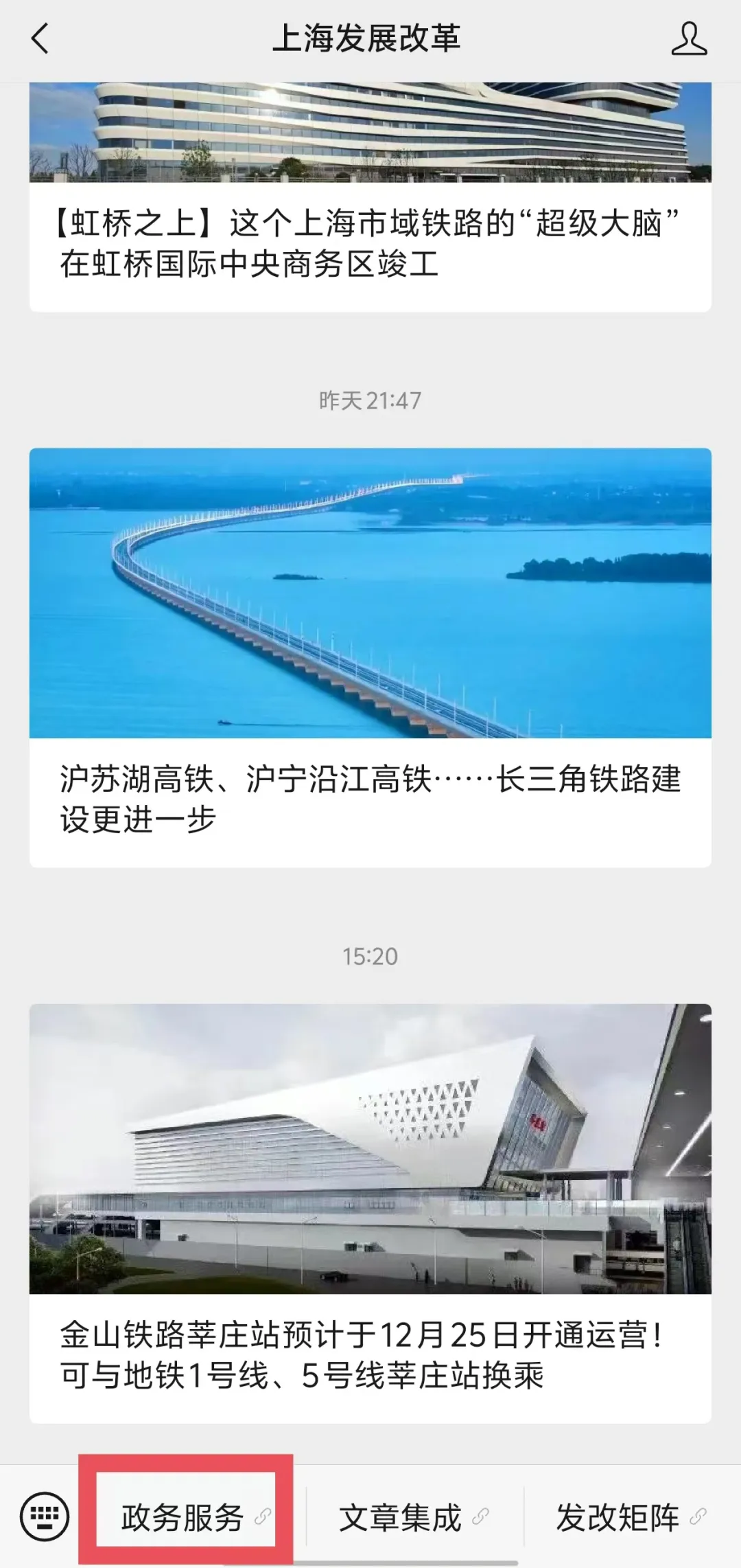 2、或关注“上海发展改革”微信公众号,点击微信按钮“政务服务”查看相关内容