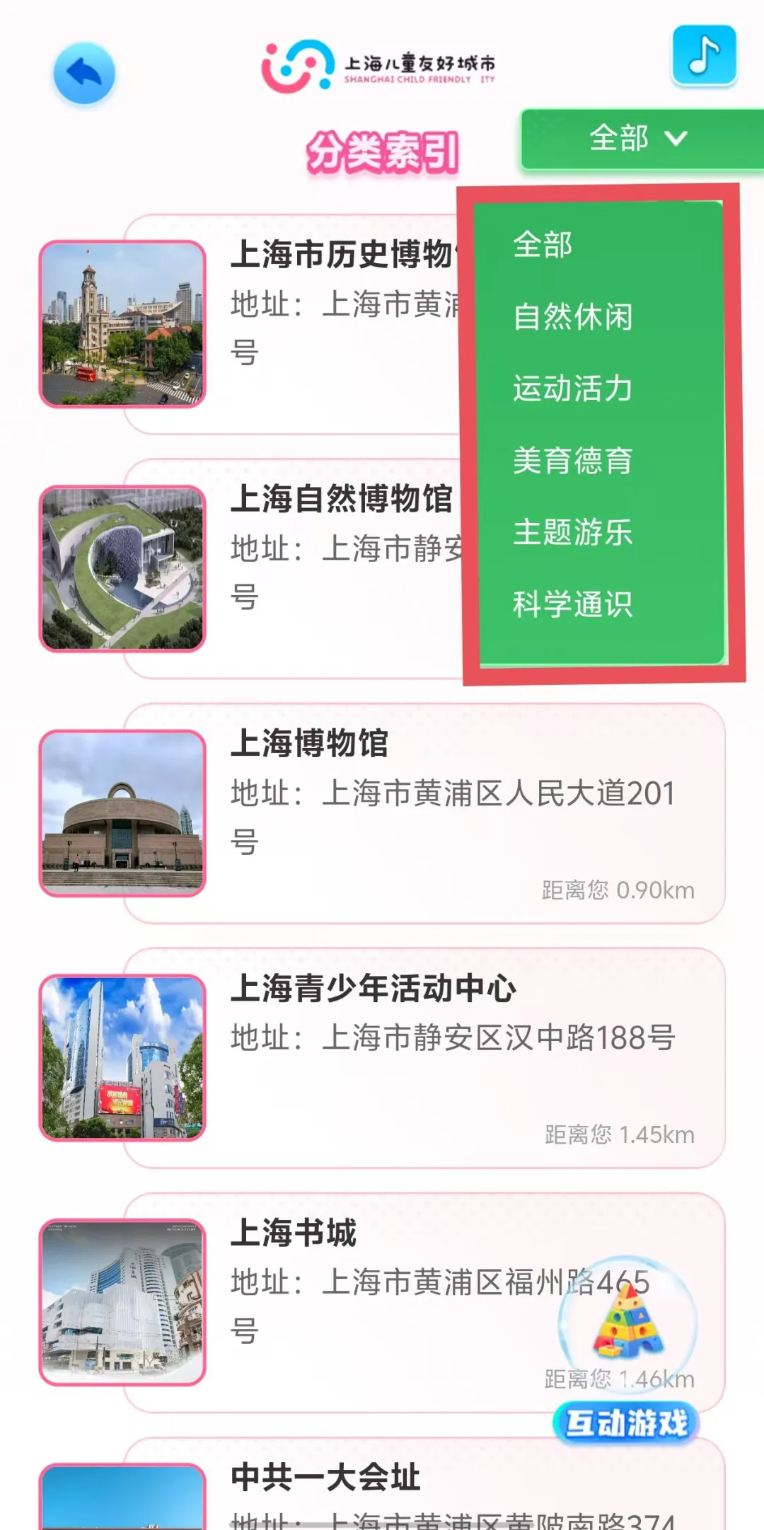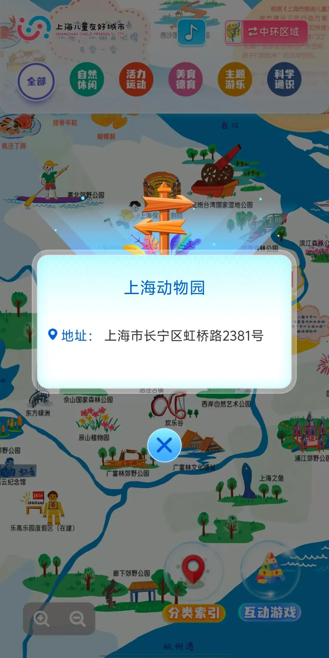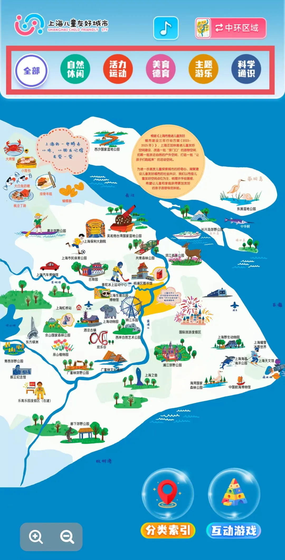 2、地标分类查询:分为“自然休闲”“美育德育”“活力运动”“科学通识”“主题游乐”等五类。可通过地图上方的按钮或地图右下方的“分类索引”查看对应地标。