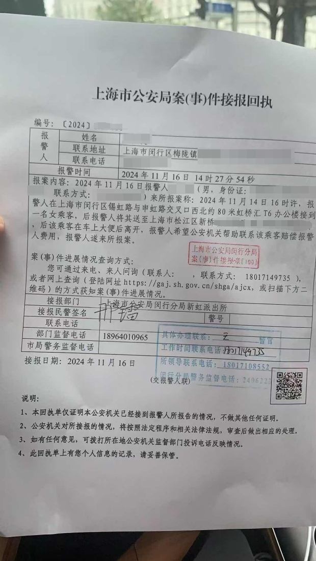 近日,网传一张警方接报回执图片,称一乘客在网约车上排泄后离开,司机报警寻人。