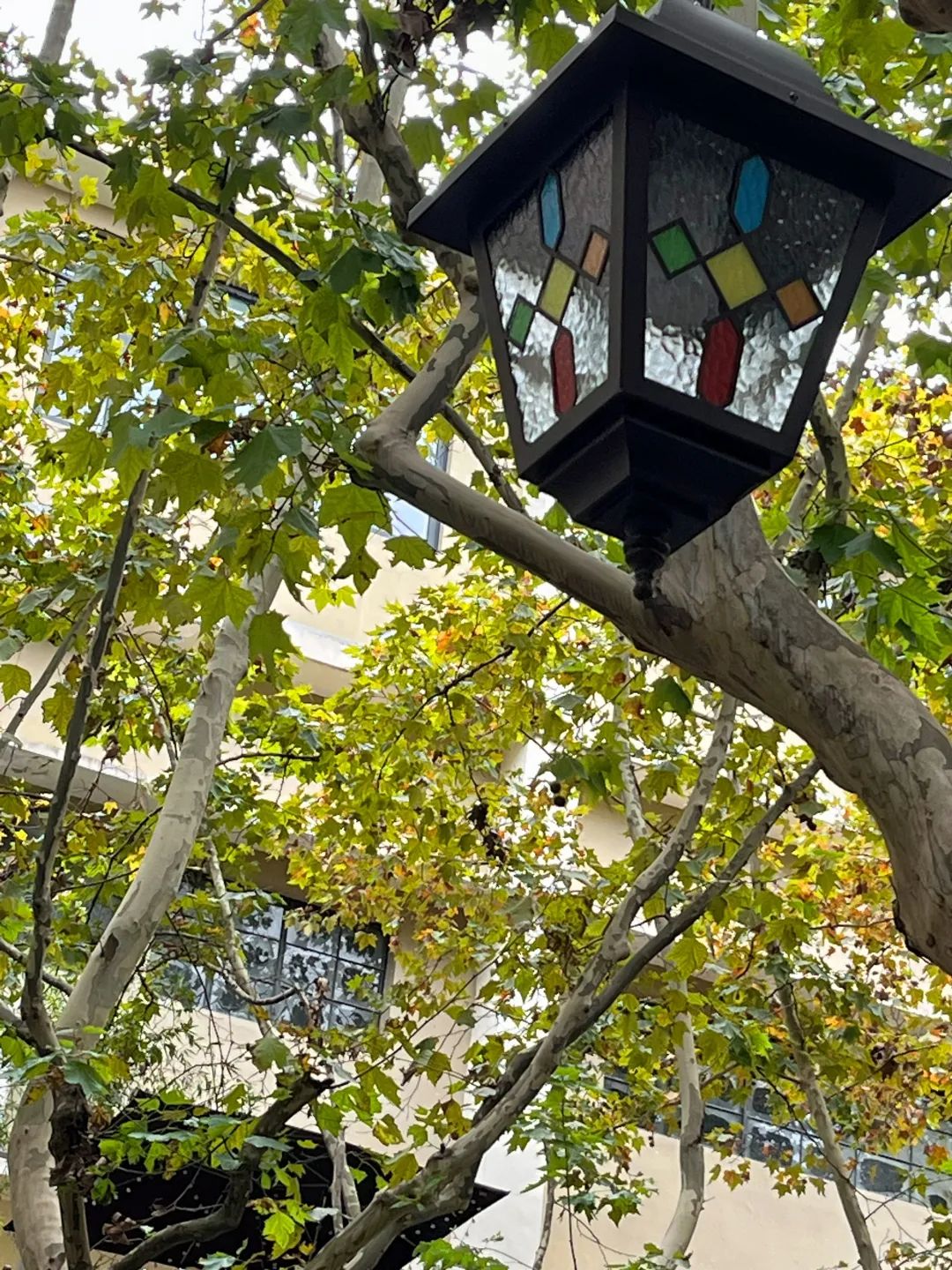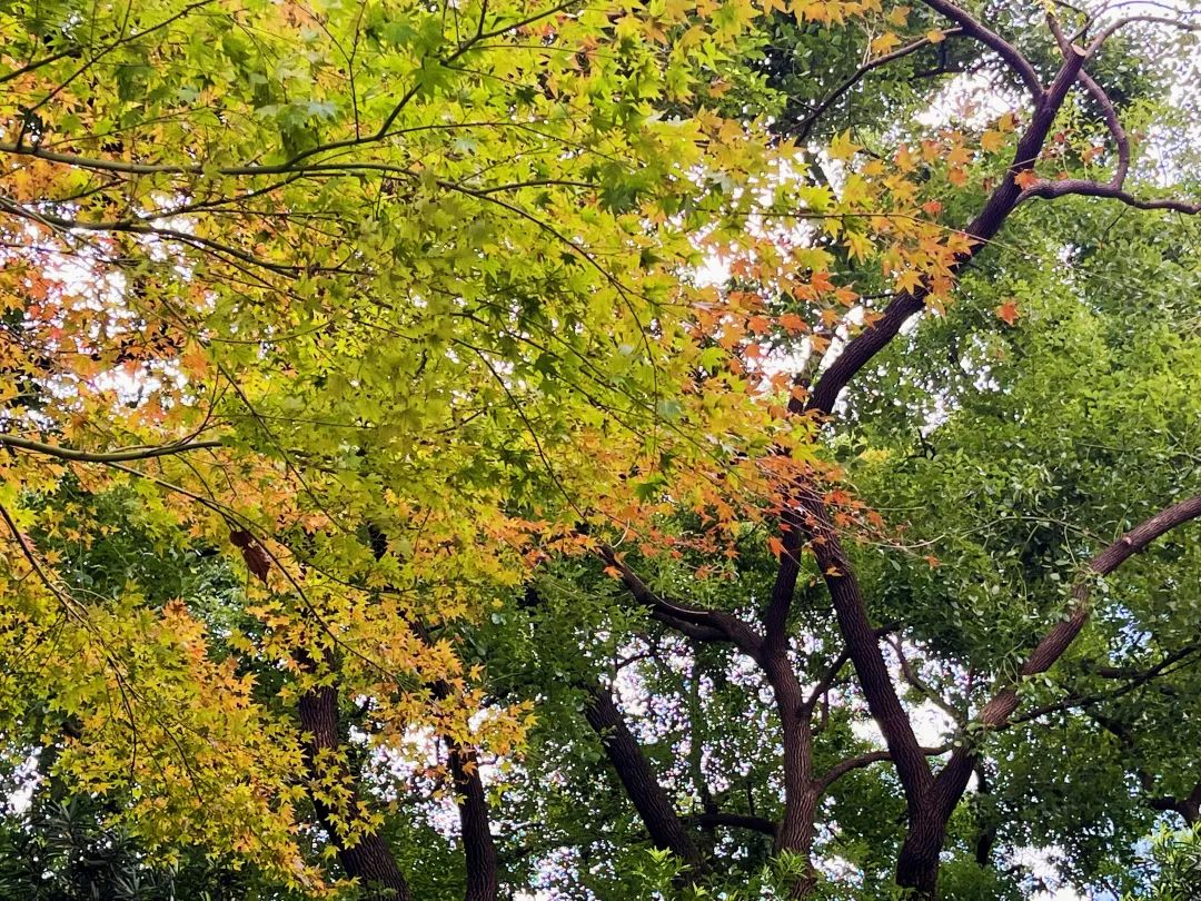在季节交替之时,悬铃木叶片就变幻出多种色彩。如今,巨鹿路的悬铃木虽未完全变黄,但比起夏天的满眼绿意,已明显呈现出暖色调,树梢也已变为黄、绿、棕三色相间。