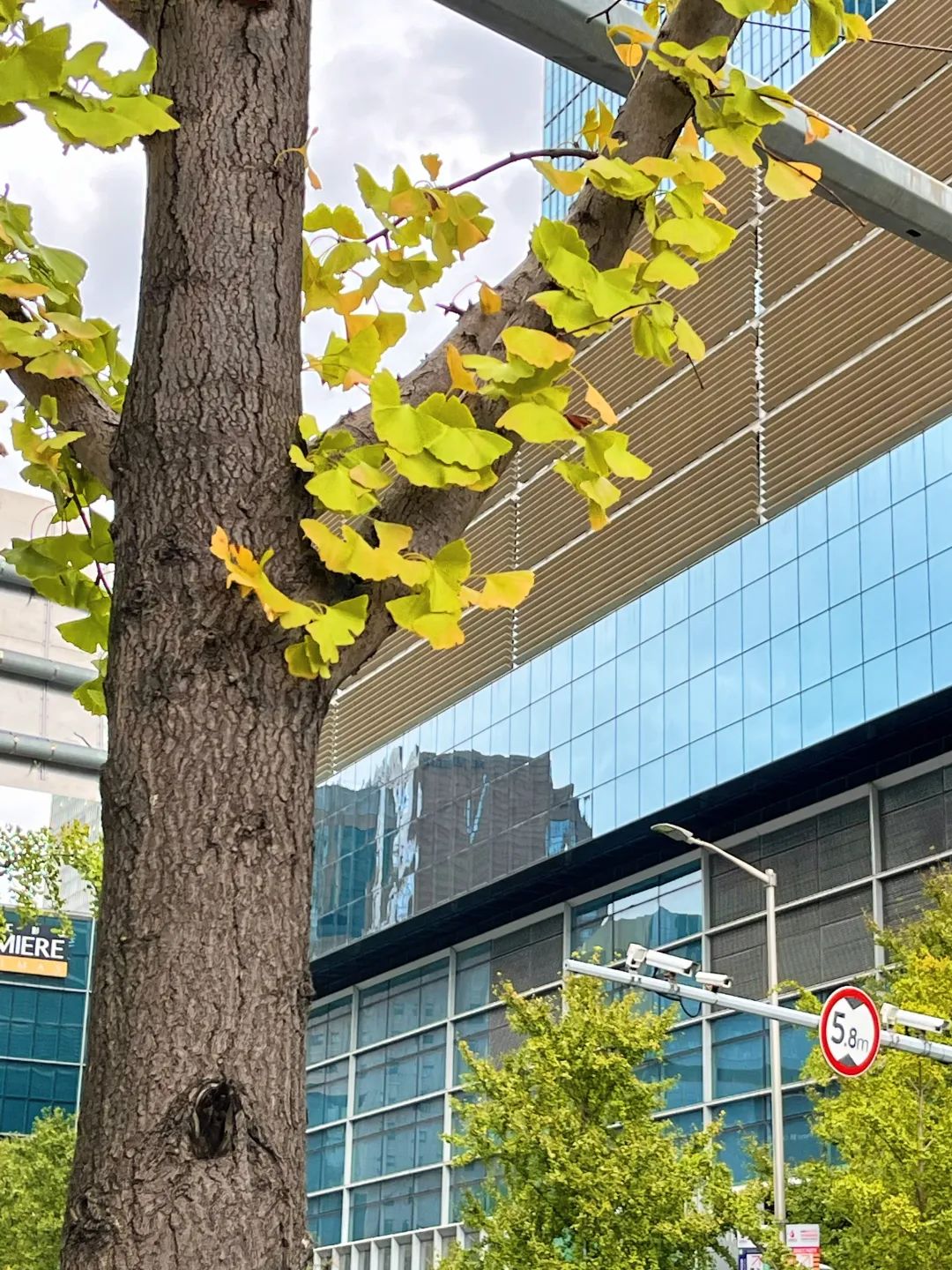 走近一看,在一棵银杏树上由绿转黄留下的渐变色,这是大自然以树叶为画布创作的水彩画。