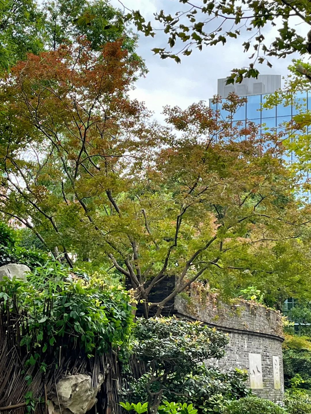 每年秋冬,静安公园的红枫都红得鲜艳夺目,吸引不少市民游客前来拍摄打卡。近日,静宝在静安公园看到,靠近八景园的几株枫树基本都已是绿叶间点缀上了星星点点的红叶。一棵树由绿转金,再转红,渐变的色彩就像四季的更替,在砖墙的衬托下格外好看。