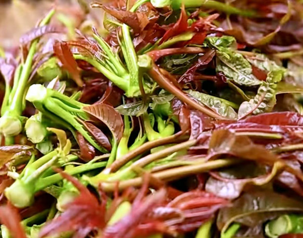香椿芽是一种长在树上的蔬菜,时令短,还有药用功效,所以比较贵。别的菜是论斤卖,而香椿是论两卖。香椿炒鸡蛋、香椿拌豆腐、炸椿芽,都是特色美食。山西有一种吃食,叫拨烂子,用土豆丝、芹菜叶,拌上面粉,蒸熟;或者用槐花、榆钱儿;当然也可以用香椿芽,更有味道。小时候,我和弟弟经常爬到树上给母亲摘槐花,打榆树叶,但是没有摘过香椿。因为找不到可以随意采摘的香椿树,从市场上买又吃不起。