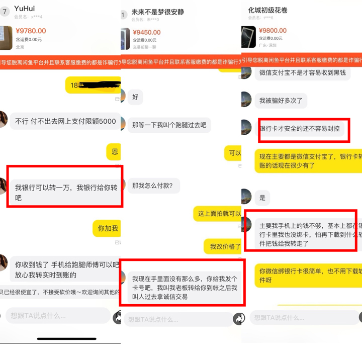 这些所谓的买家往往以二手平台交易需要手续费、自己支付宝有限额、公司财务直接转账为由,获取卖家的银行卡信息,并用此银行卡作为电信诈骗资金“洗钱”的收款账户,而自己直接从卖家这里取走贵重物品。因此,真实打款人实际是散落在全国各地的受骗者……