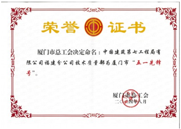近日,厦门市总工会发布《厦门市总工会关于命名市“五一先锋号”和表扬“五一先锋号”优胜集体的决定》,中建七局六公司技术质量系统首度获评厦门市“五一先锋号”,实现公司属地工会荣誉再突破。