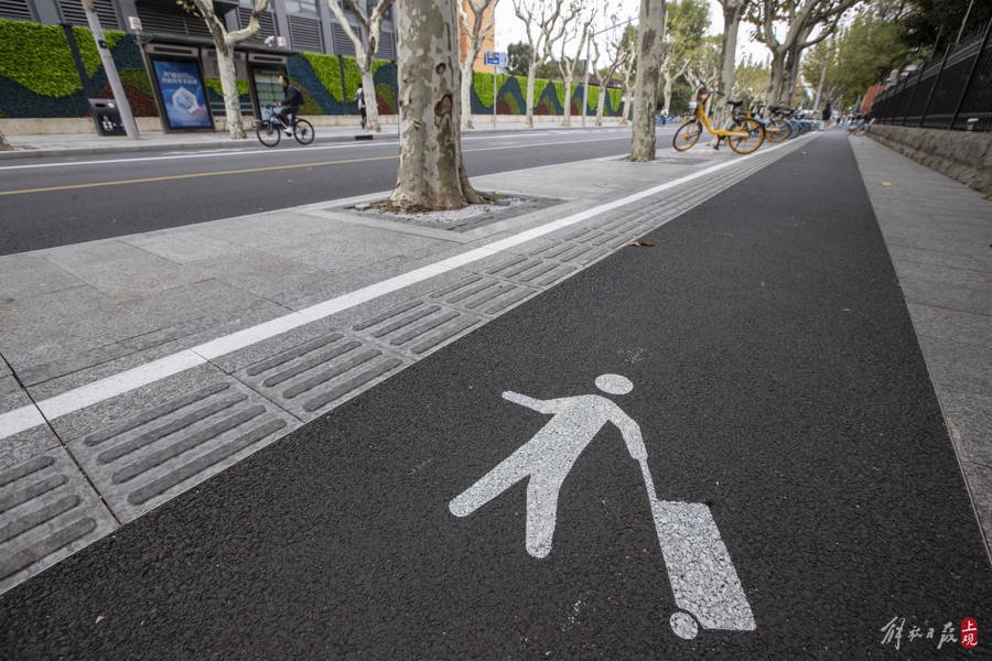 近日,国权路上出现了一条宽约60厘米长达1公里多的“拉杆箱道”, 这条特色小道为拉着行李箱进出地铁站的复旦大学师生提供方便。 本报记者 赖鑫琳 摄