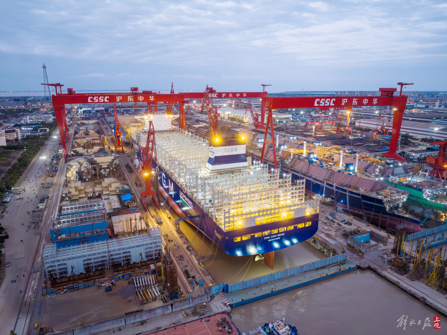 2024年11月20日,由沪东中华自主研发设计建造的全球最大24000TEU级液化天然气(LNG)双燃料动力超大型集装箱船首制船,提前10天在该公司长兴岛西部厂区1号船坞顺利出坞,该船是中国船舶制造的最新一代“超级带货王”。 张文豪 摄