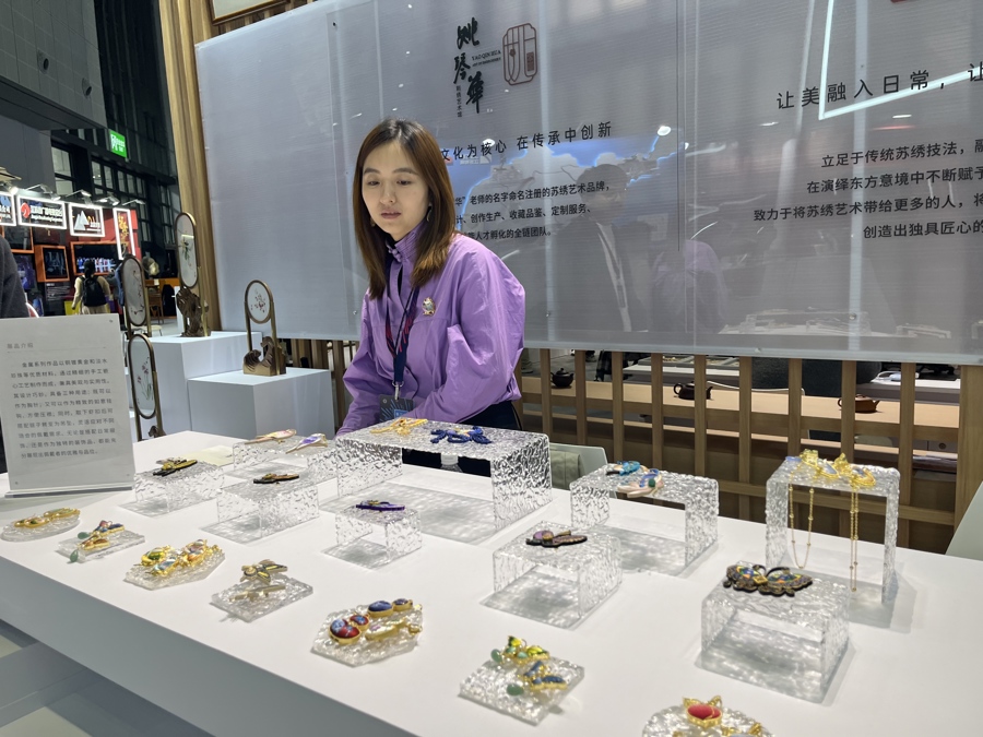 一个苏绣展台上,摆放着一件件苏绣盘扣胸针,既各式蝴蝶造型,也有卡通化的小鸟、葫芦。“这两年国风太火,在苏绣的品类里首饰一直比较少,所以我们就在思考如何创新,做一些新中式的产品。”“90后”青年苏绣传承人岳琰2020年就带着一系列苏绣双面绣作品首次参加长三角文博会,“当时反响很不错,如今我们的东西更多了”。去年夏天,岳琰将苏绣和非遗盘扣结合,推出一系列蝴蝶造型的盘扣胸针,“截至目前全渠道的营业额达到1000万元,带动了苏州当地绣娘的就业。”