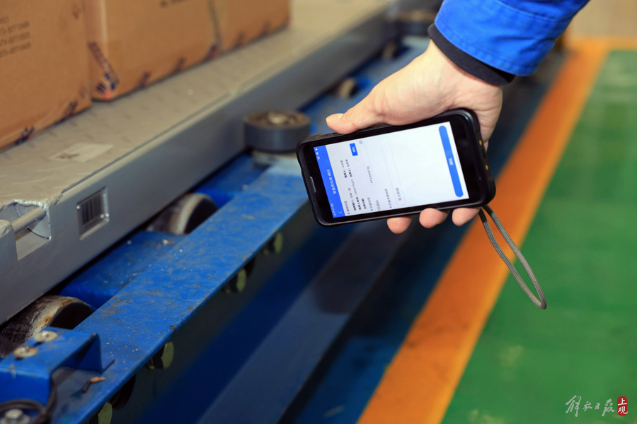 这是工人在智能立体仓库操作邮轮建造耗材入库。