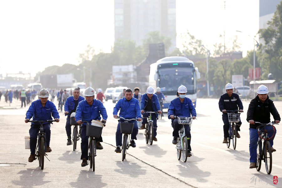 早上七时许,浩浩荡荡的工人从南西北三个大门骑行进入厂区上班。