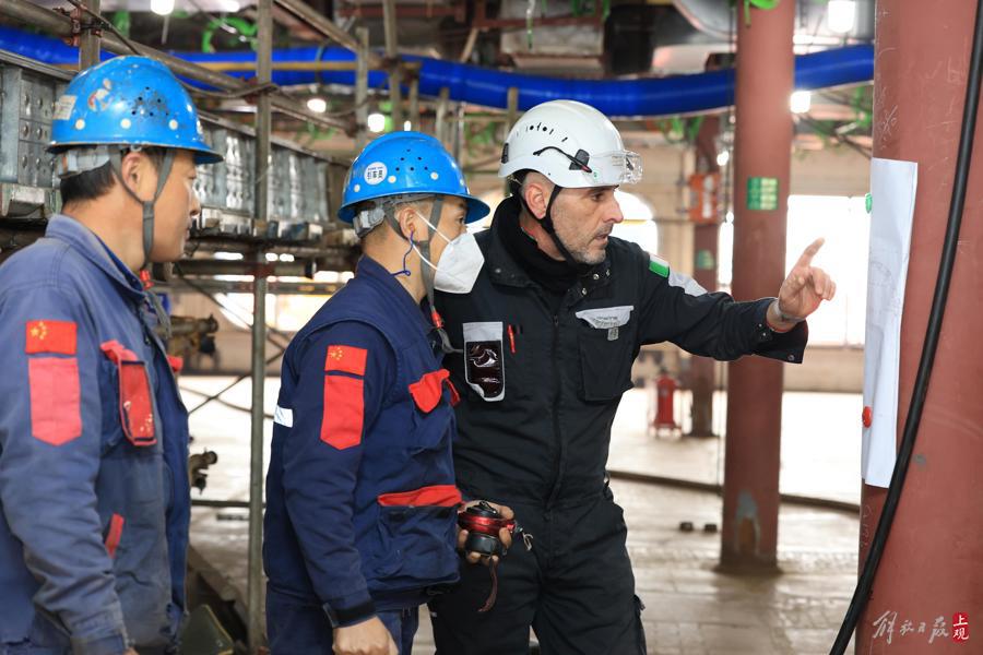 中外技术人员在邮轮建造现场交流设备安装事宜。