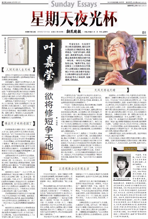 叶嘉莹先生一生从事中国古典诗词的教研,擅长以深入浅出的文字解读诗词。她这样说过:“无论写作也好,讲授也好,我所要传达的,可以说都是我所体悟到的诗歌中的一种生命,一种生生不已的感发的力量。”她著作等身,先后出版有《王国维及其文学批评》《灵溪词说》《迦陵论词丛稿》《中国古典诗歌评论集》《古典诗歌吟诵九讲》《给孩子的诗词》等几十种论著,见解独到,卓然成家。