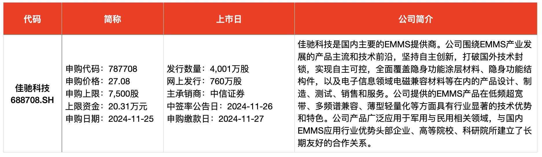 澎湃新闻根据Wind及公开信息梳理统计,本周(11月25日-11月29日),安排3只新股网上申购。申购的新股为成都佳驰电子科技股份有限公司(简称“佳驰科技”,688708.SH)、陕西科隆新材料科技股份有限公司(简称“科隆新材”,920098.BJ)、山东博苑医药化学股份有限公司(简称“博苑股份”,301617.SZ)。其中,佳驰科技为国内隐身涂料龙头。