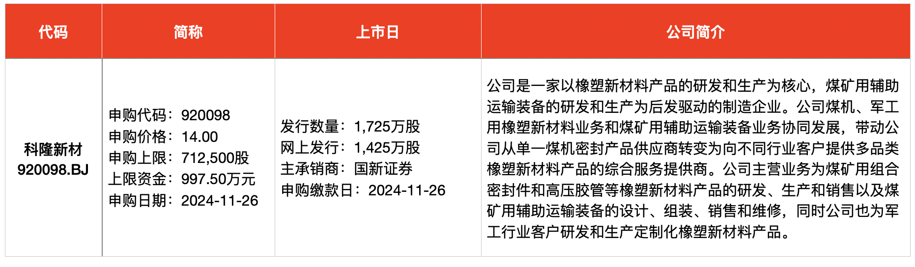 申万宏源表示,科隆新材为煤机液压支架综合服务“小巨人”,在煤炭行业各细分领域均处于领先地位,并成功“民转军”,已与数十家国防军工企业和科研院所建立了紧密合作关系,同时积极向高铁和风电行业拓展。从博弈面看,公司首发估值、PE(24E)均低于可比公司均值、中值,可流通比例和老股占比较低,首日抛压较小,建议积极参与。