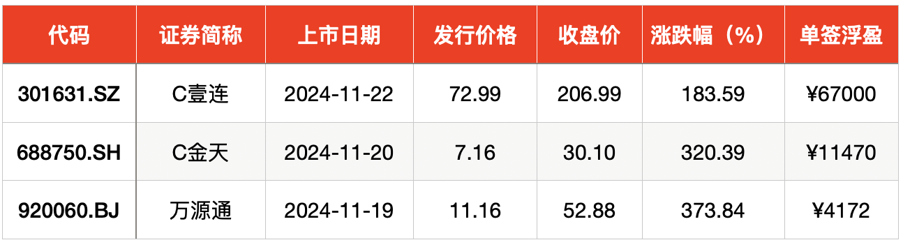 11月22日,壹连科技在创业板上市,发行价为72.99元/股。上市首日开盘涨180.86%,截至首日收盘,壹连科技报206.99元/股,涨幅183.59%。以收盘价计算,投资者中一签浮盈高达6.7万元。