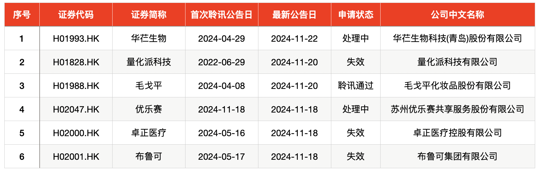 Wind数据显示,上周,港股有1家企业递交招股书,其中,苏州优乐赛共享服务股份有限公司首次递交;华芢生物科技(青岛)股份有限公司为更新招股书。