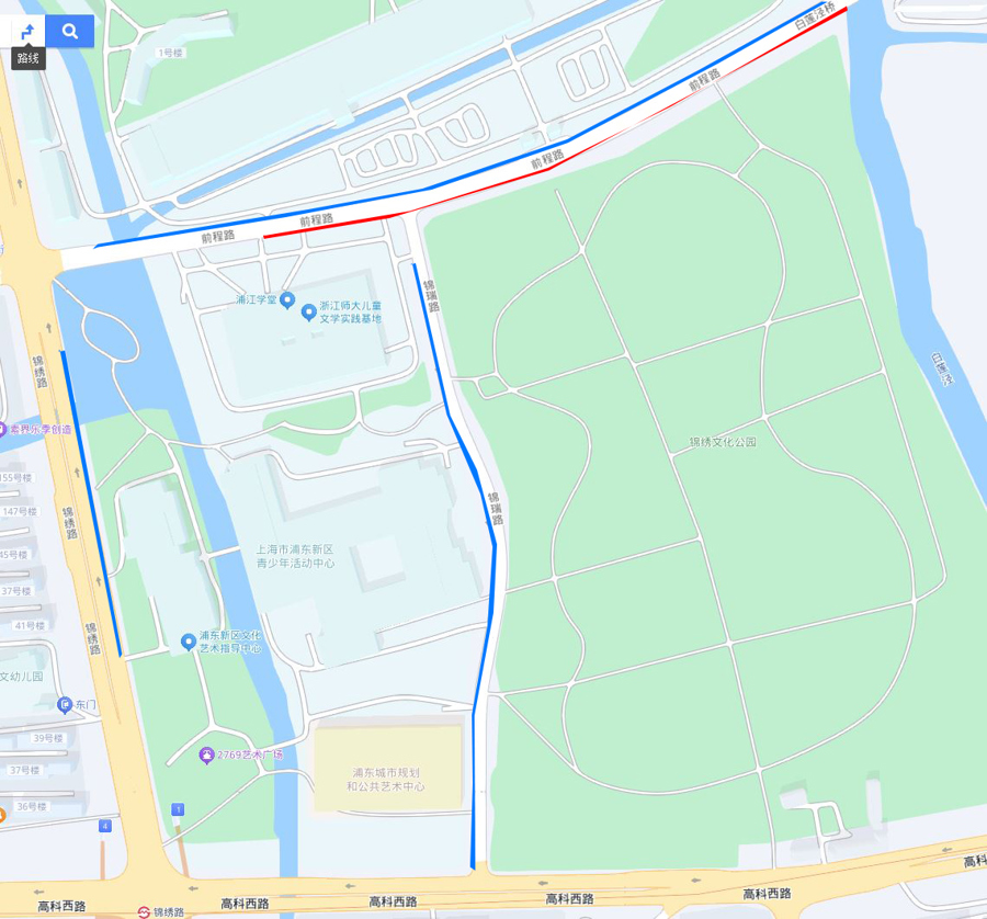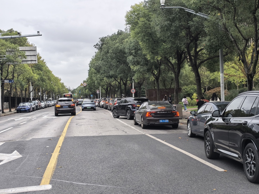 张女士向记者复盘了当天下午她的停车经历。下午近2时,她驾车沿锦绣路由北向南行驶,到了前程路左转,打算前往浦东图书馆停车。浦东图书馆的车库入口就设在前程路上。拐过去她发现,等待停入图书馆的车辆队伍,已经从入口处,一直排到了前程路锦绣路路口。拐弯车流无法插入其中,张女士只能继续沿前程路向东开,前方前程路的南侧设有一段收费路面停车场,是图书馆停满后的替代方案。但往前开了一段她发现,前程路南侧路面停车场也已停满。此时,张女士只能选择将车辆停到东侧南北向锦瑞路的西侧,或者是前程路的北侧路边,这两处虽未设路面停车场,但长期以来被大家“默认”不会被贴条,可以停车。但张女士沿锦瑞路一直开到高科西路,仍然没能找到车位,她只能又绕了一圈返回前程路,最终一直开到白莲泾桥东侧才在路边找到空处停了车。这里已经超出了“默认”的安全停车范围,距离青少年活动中心更已近1公里开外……待她停好车,带孩子骑共享单车返回青少年活动中心,早已错过了下午2时的活动。