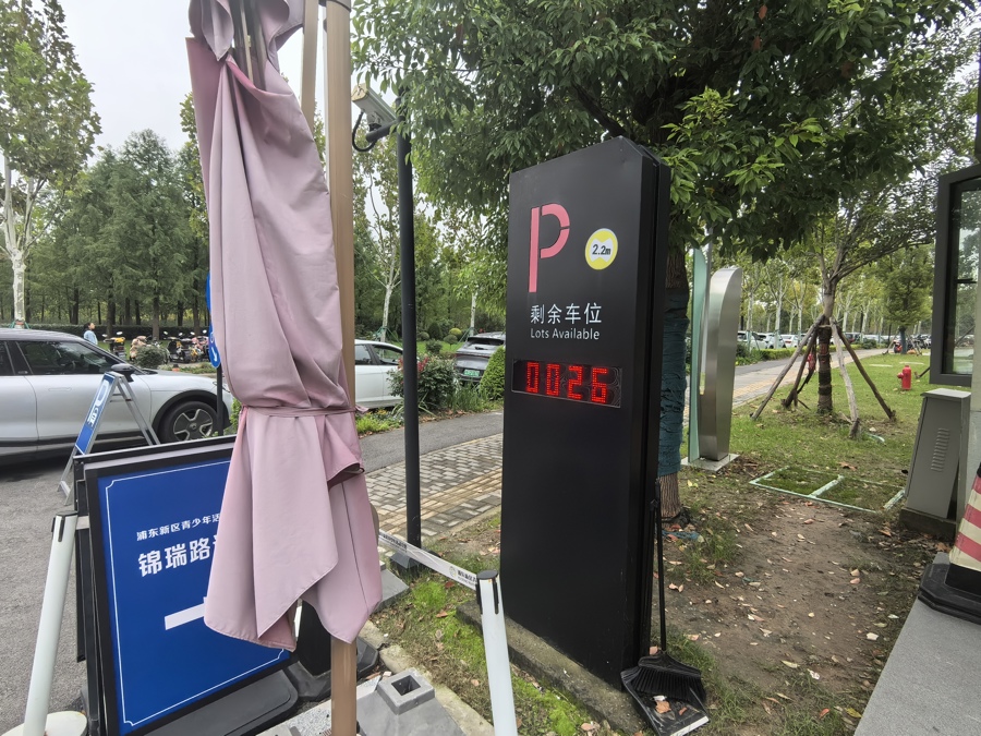 △浦东青少年活动中心车辆入口处一旁的立柱上,硕大的红色LED屏幕将剩余车位数始终锁定在“26”个。