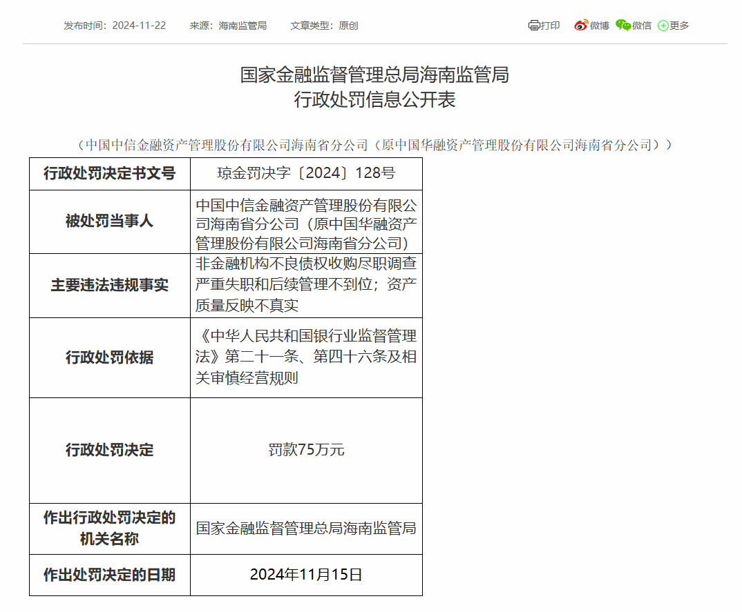 据国家金融监督管理总局海南监管局行政处罚信息披露,中国中信金融资产管理股份有限公司海南省分公司(原中国华融资产管理股份有限公司海南省分公司),因非金融机构不良债权收购尽职调查严重失职和后续管理不到位;资产质量反映不真实,被罚款75万元。