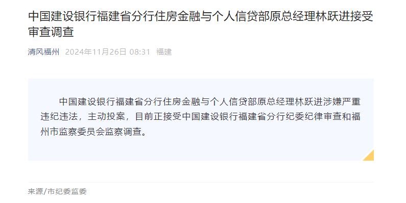 据福州市纪委监委消息,中国建设银行福建省分行住房金融与个人信贷部原总经理林跃进涉嫌严重违纪违法,主动投案,目前正接受中国建设银行福建省分行纪委纪律审查和福州市监察委员会监察调查。
