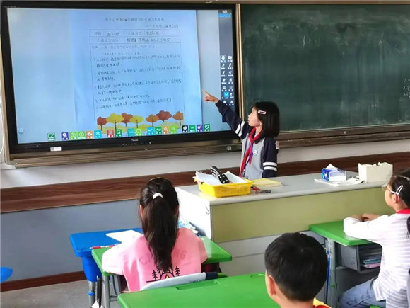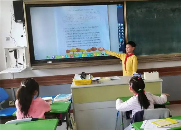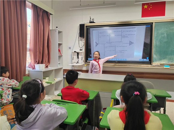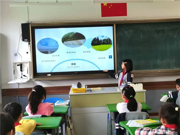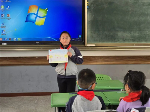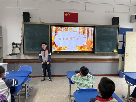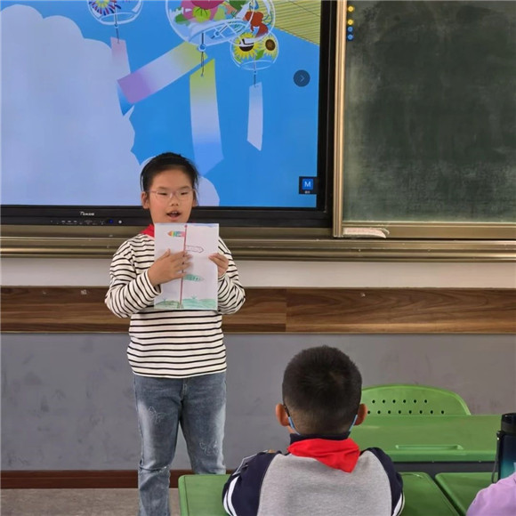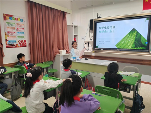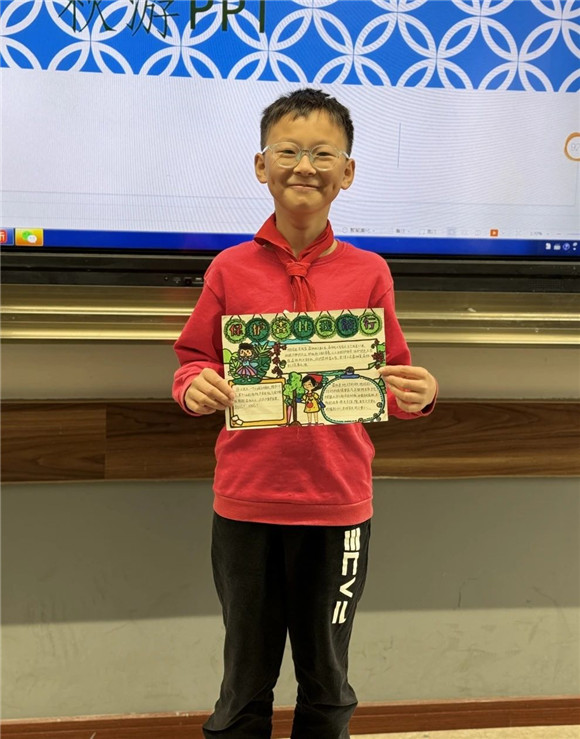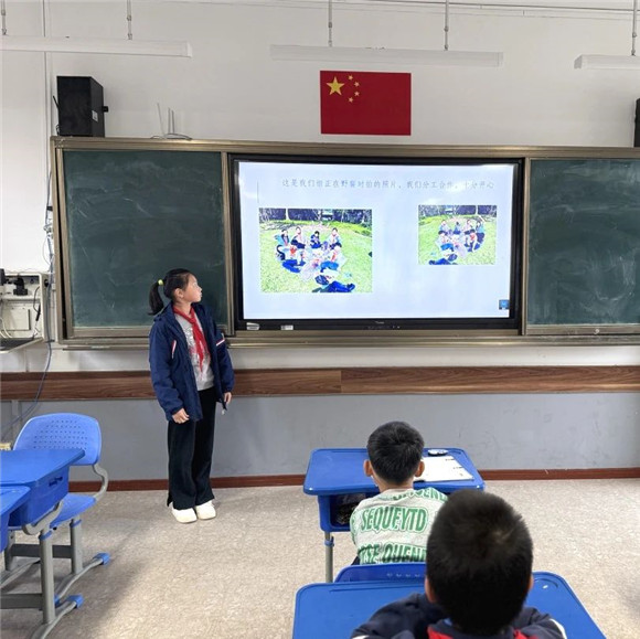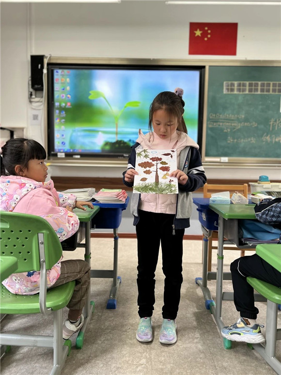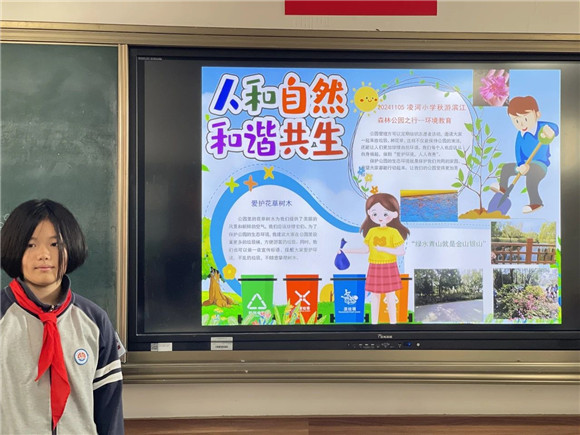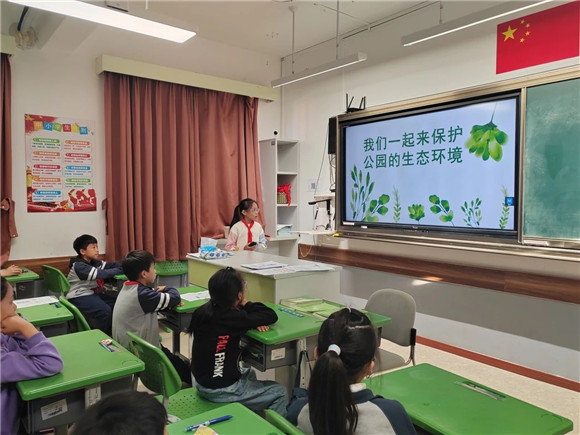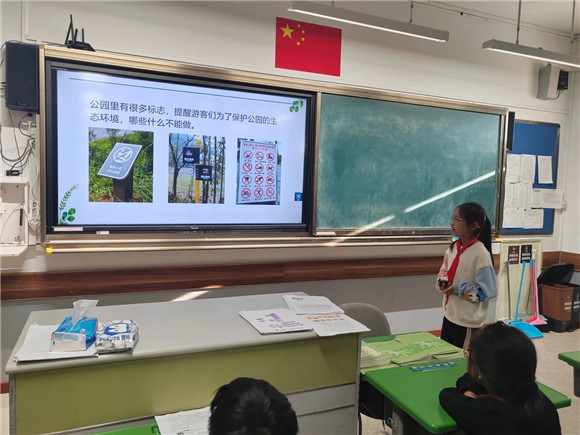 在综合实践活动课上,同学们进行了项目成果展示暨汇报交流。有的同学介绍了自己的创意作品,有的同学通过PPT介绍了标志的含义和保护公园生态环境的做法,展示的内容丰富,形式多元。