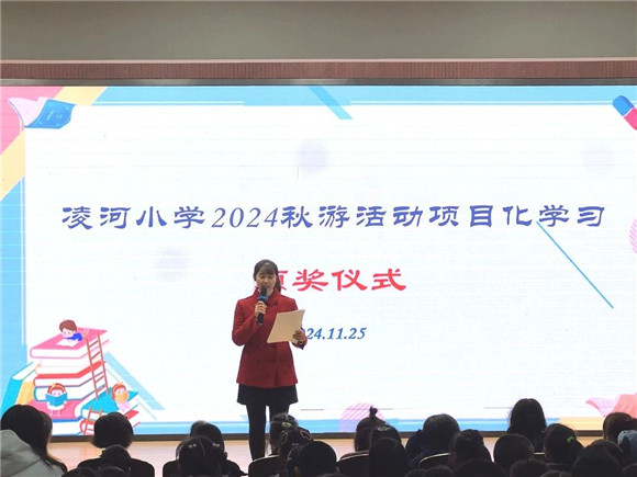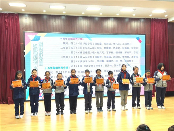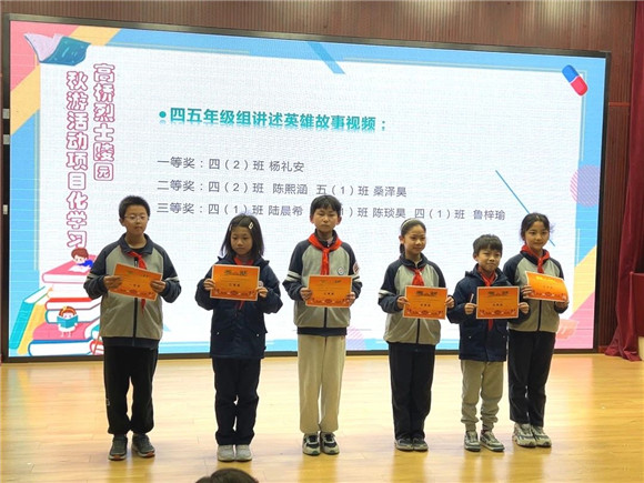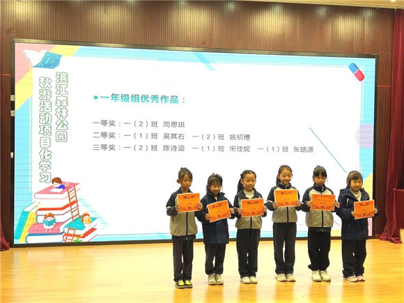 在11月25日上午的升旗仪式上进行了本次秋游活动项目化学习的总结会暨颁奖仪式。获得优秀小组的小组代表和个人作品获奖的同学们纷纷上台领奖,喜悦之情溢于言表。台下的组员们也抑制不住激动的心情,因为她们收获的不仅仅是荣誉,更有来自团队的爱与温暖。