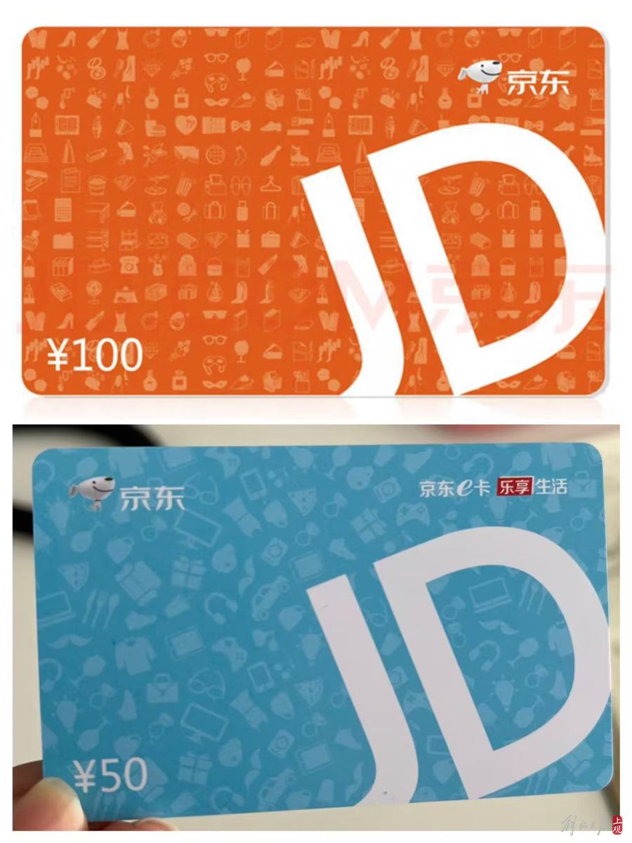 上图:京东官方公布的购物卡样照;下图:网友收到的“购物卡”